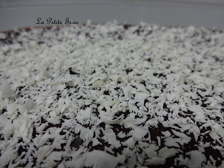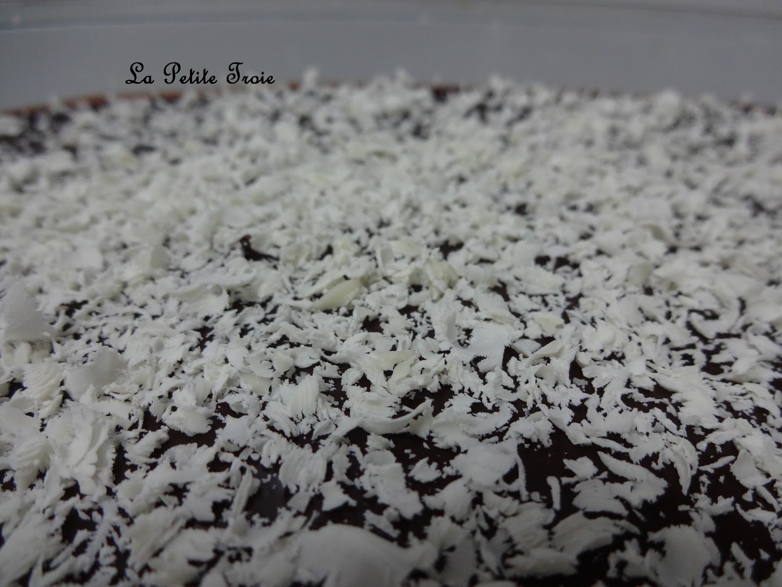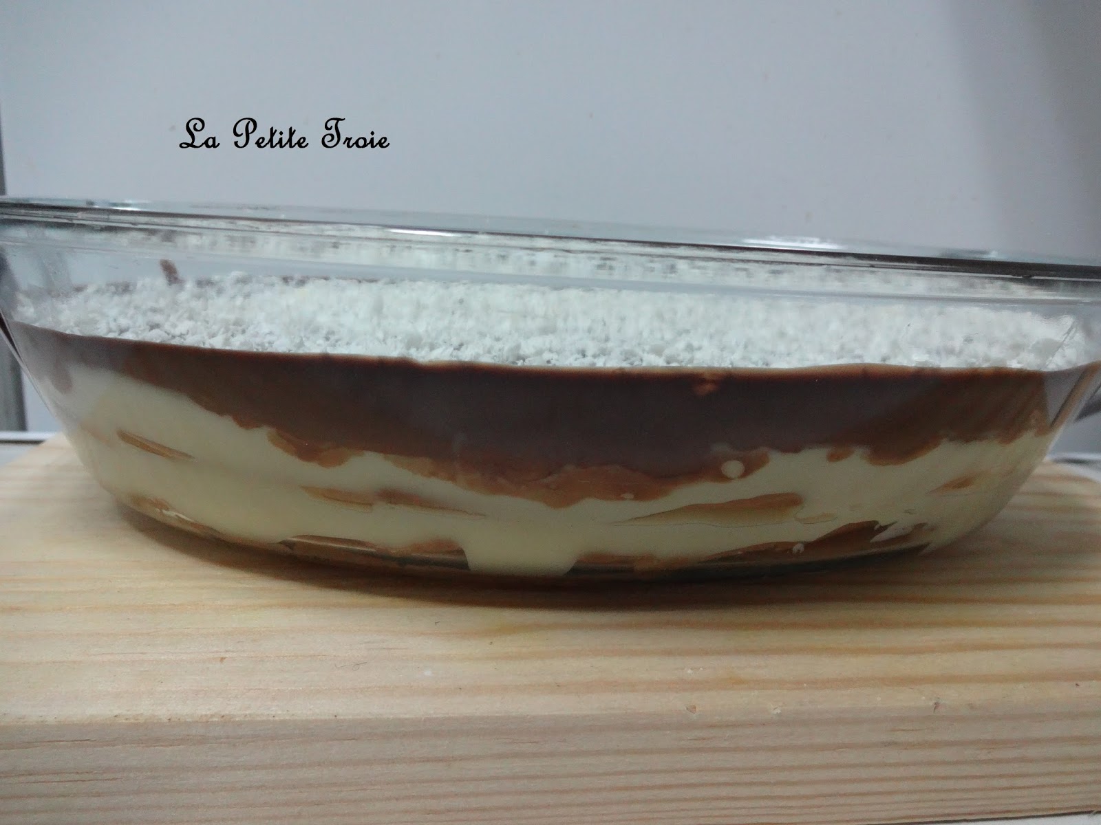 Tarta de chocolate con galletas y crema pastelera: capa de galletas, capa de crema, capa de galletas, capa de crema, capa de galletas, capa de chocolate negro decorada con chocolate blanco.